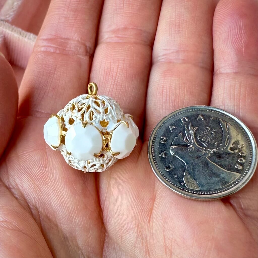 This vintage bead design features six, extra-large, 8mm, clear, opaque white-coloured, brass-prong-set, Swarovski crystal rhinestones, which are sandwiched between two, white-enamelled, gold tone, filigree bead caps, along with the original head pin loop.