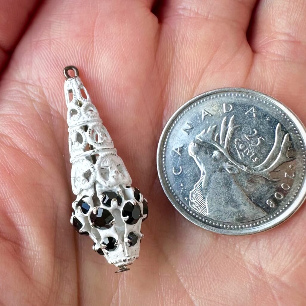 This enchanting, vintage bead design features an elegantly, elongated, teardrop shape, made of white enamelled, filigree brass, with a sprinkling of sparkly, jet black-coloured, Swarovski crystal rhinestones at the base, and also includes the original head pin loop.