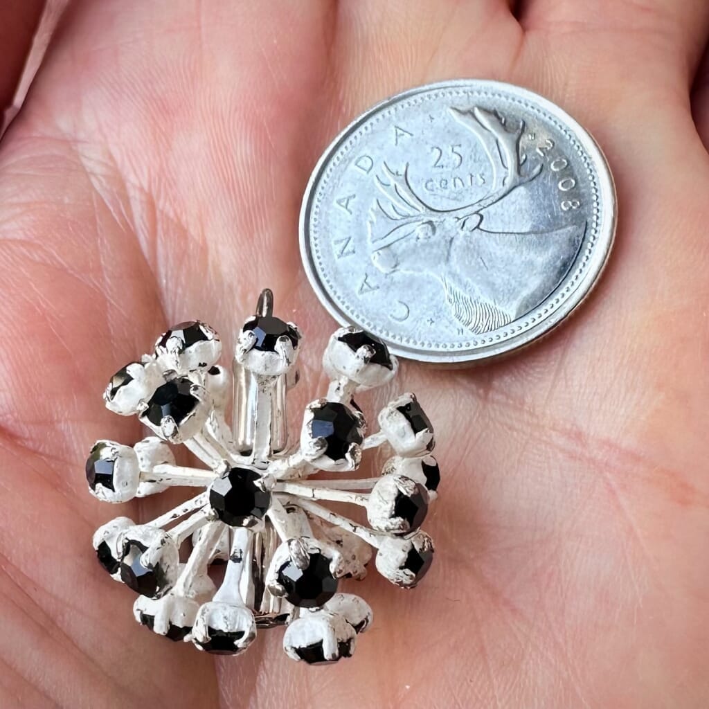 This vintage bead design is reminiscent of fireworks, festively bursting out high in the sky, and features oodles of small, round, jet black-coloured Swarovski rhinestones, which are prong-set at the end of white-enamelled wire "sticks" from a centre core, along with their original head pin loop. Almost identical to Style #: SVBB-1003-MLT, except it's bigger!