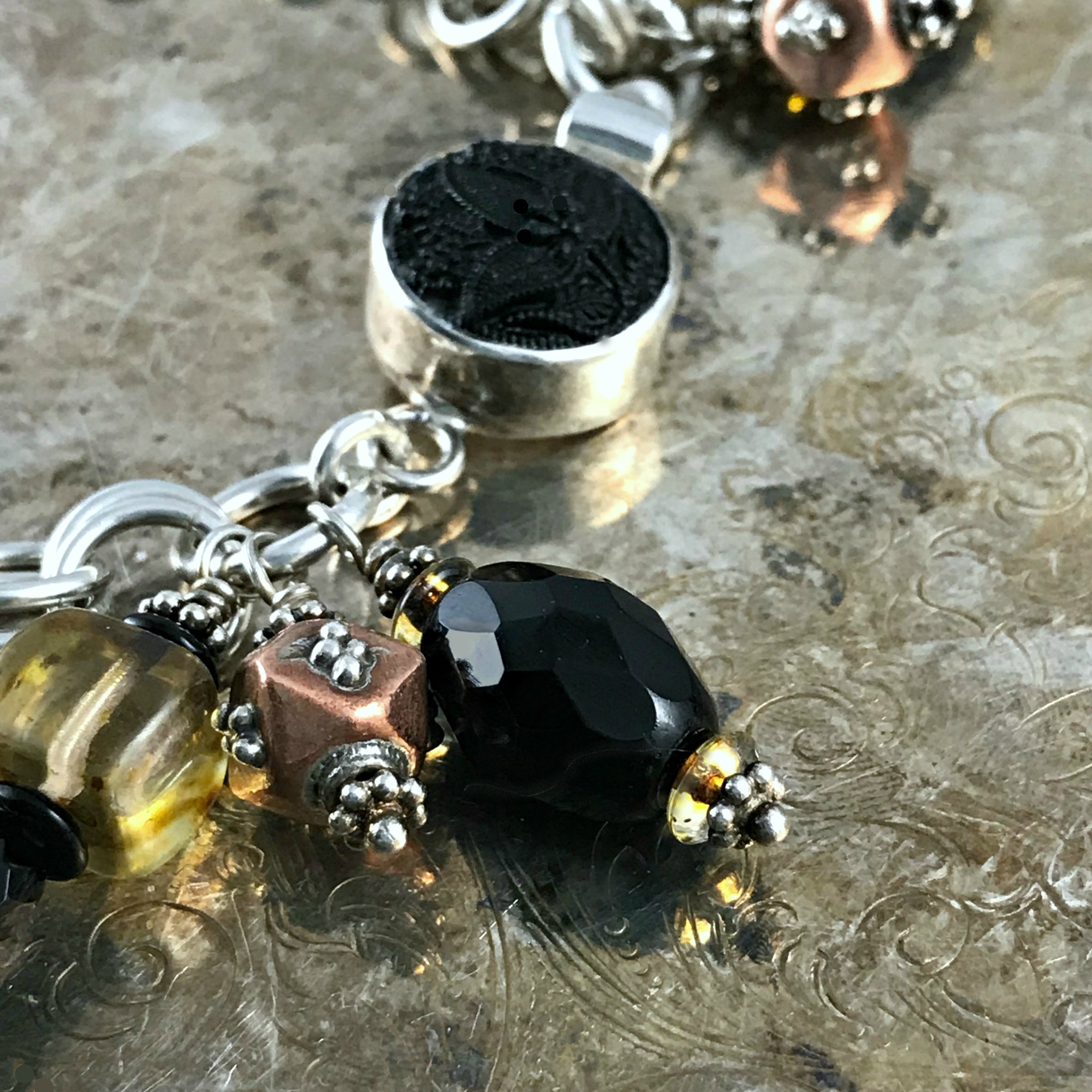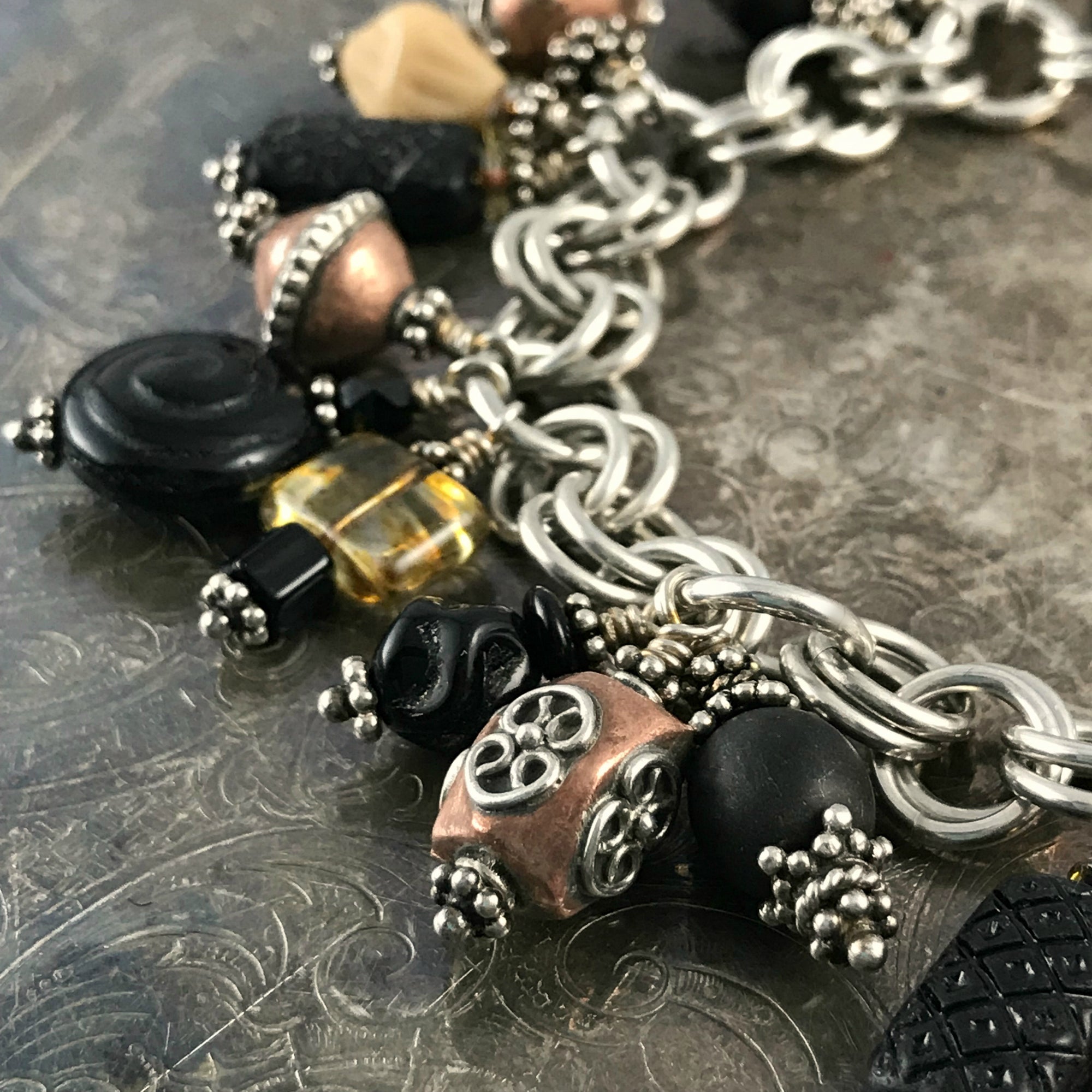 Czech glass, copper and sterling bead charms on a handcrafted sterling silver charm bracelet.